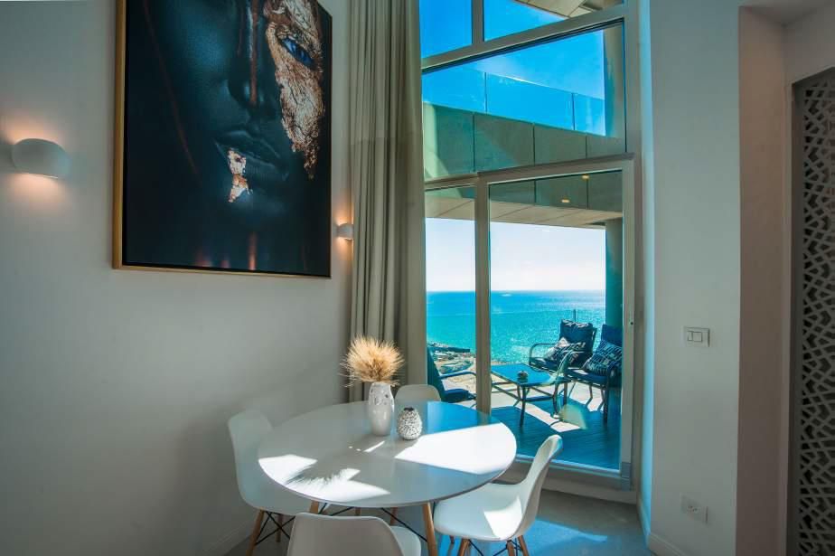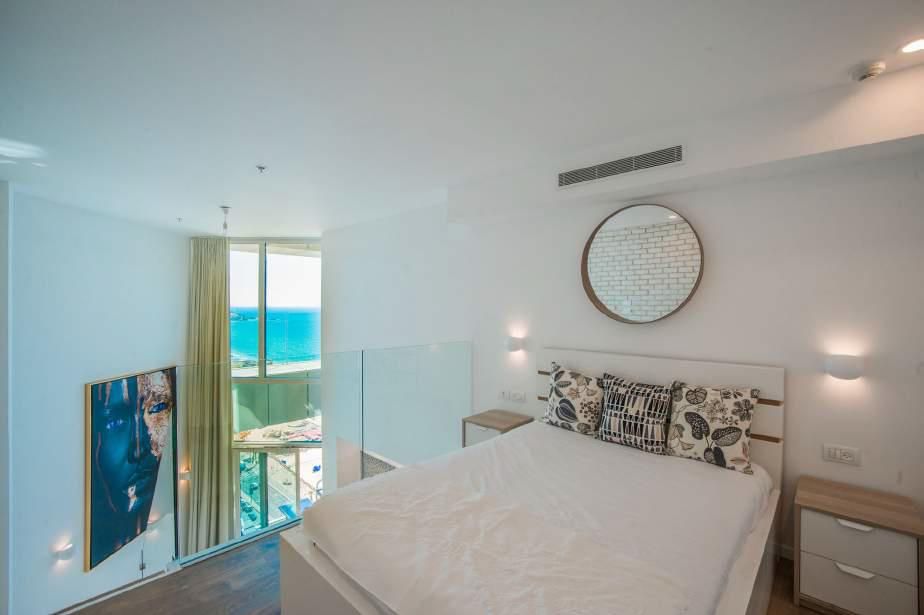 למכירה דירת יוקרה יפיפיה קו ראשון לים! 58 מ"ר בחלל פתוח עם תיקרה גבוהה מאוד + 12 מ"ר חדר שינה בקומת גלרייה + 18מ"ר מר מרפסת אירוח נהדרת. חניה פרטית. בניין יוקרתי עם שומר, בריכה ועוד.